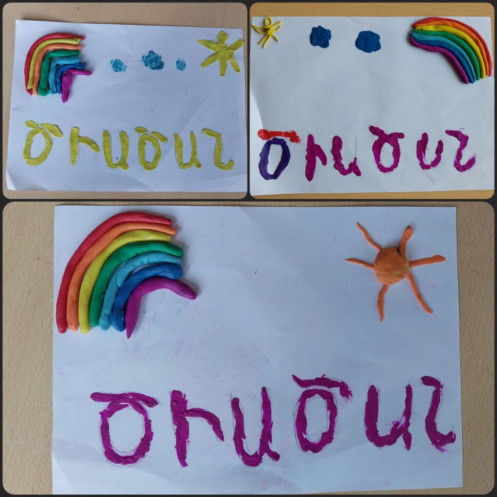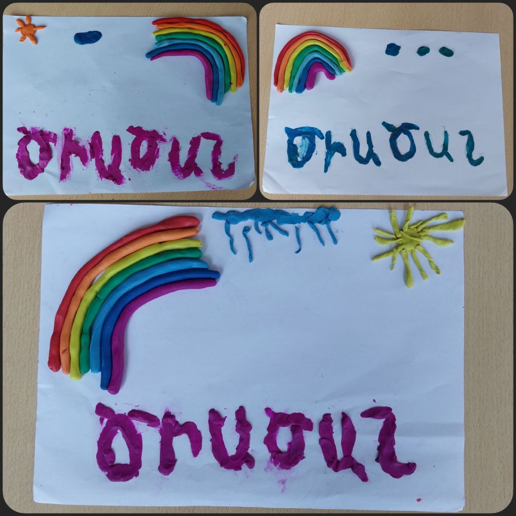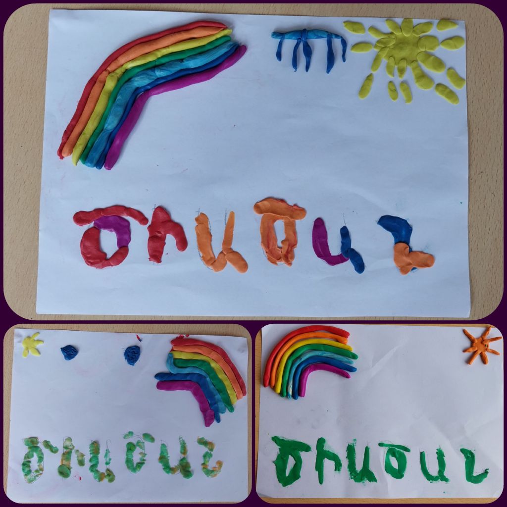 Ծեփամածիկով պատրաստեցինք ծիածաններ և թղթերի վրա ծեփեցինք նաև ծիածան բառը։
