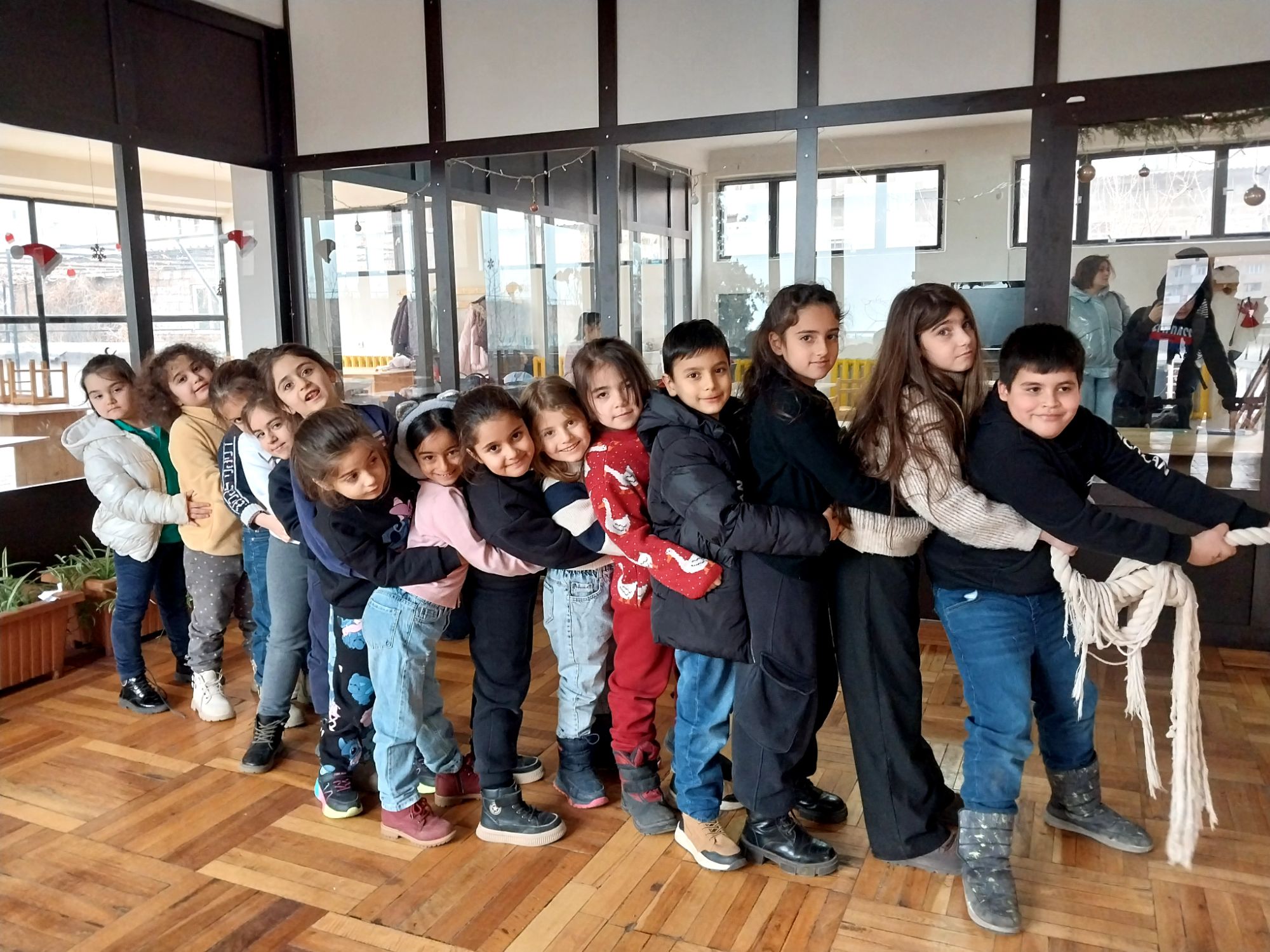 Հունվարյան ճամբարի ընթացքում` Ազգագրության փառատոնի շրջանակներում, 1.1 և 1.2 դասարանի երկարացված օրվա սովորողները խաղում են ազգային խաղ ` Պարան քաշոցի