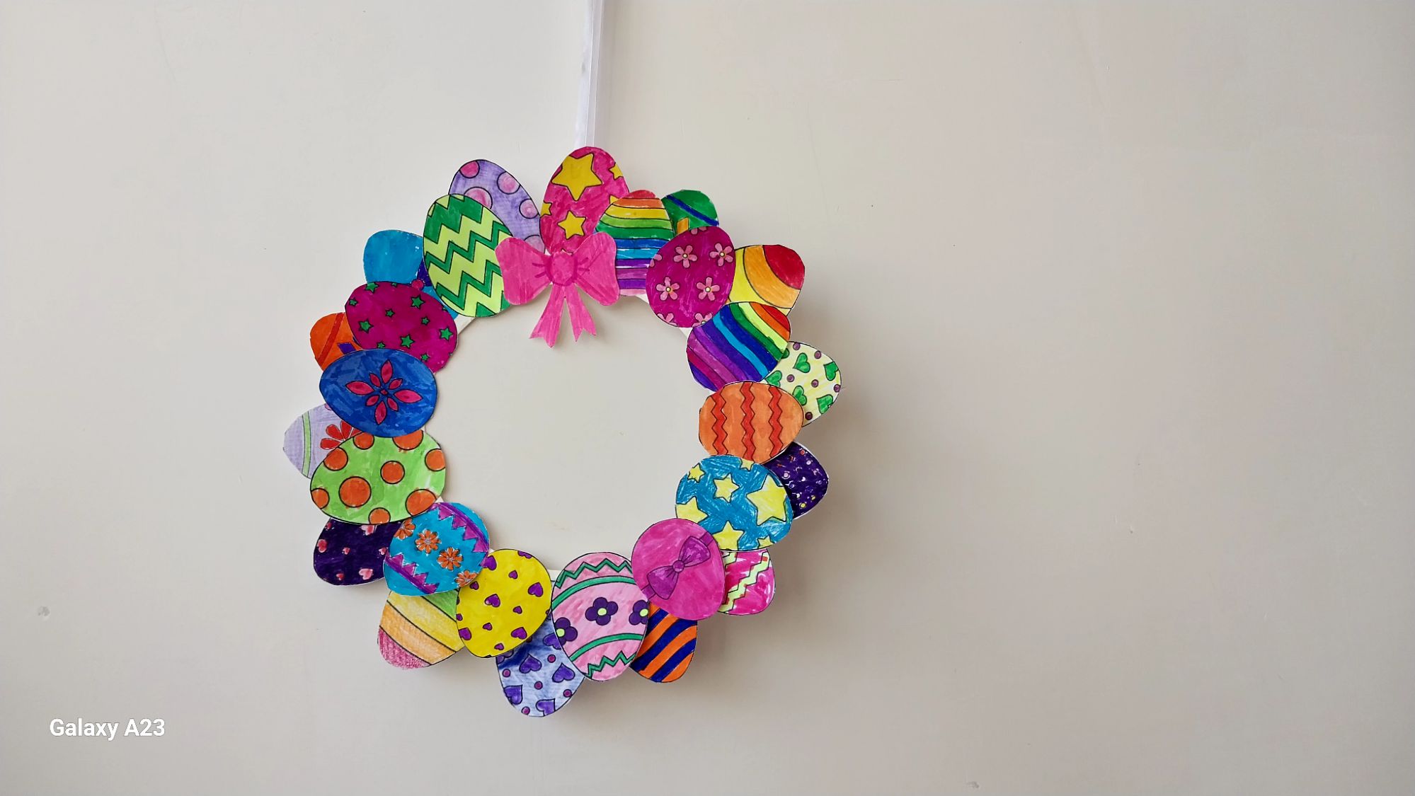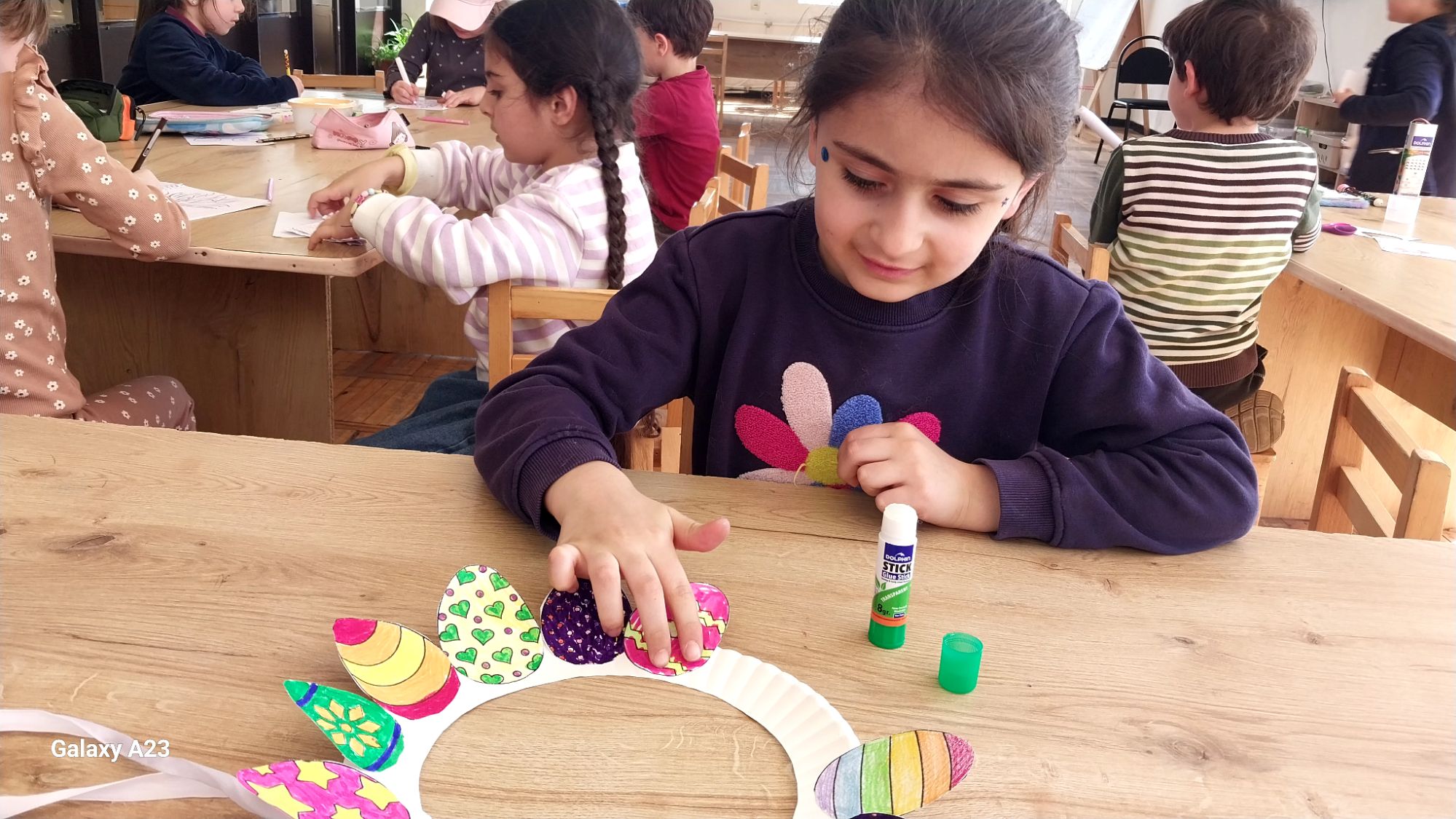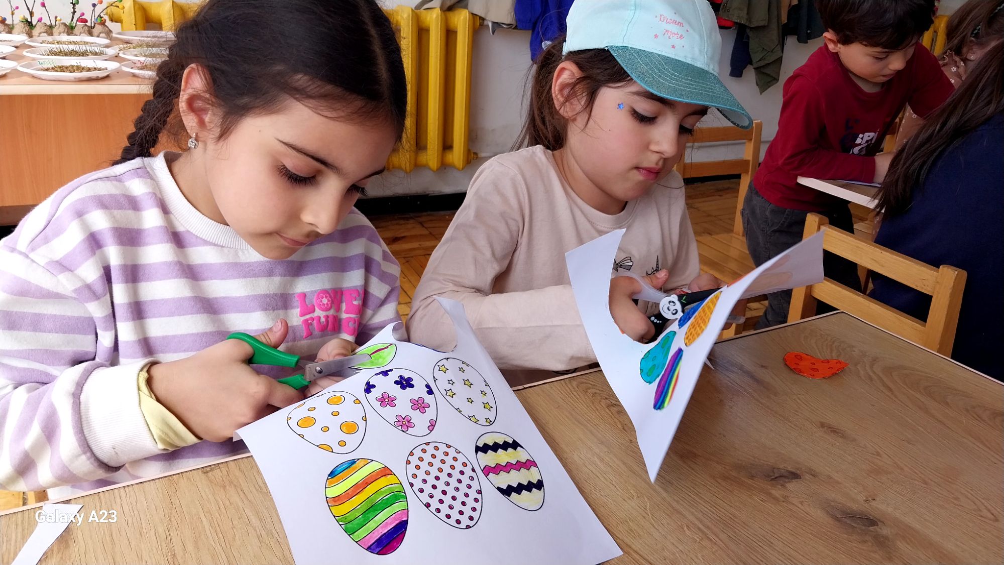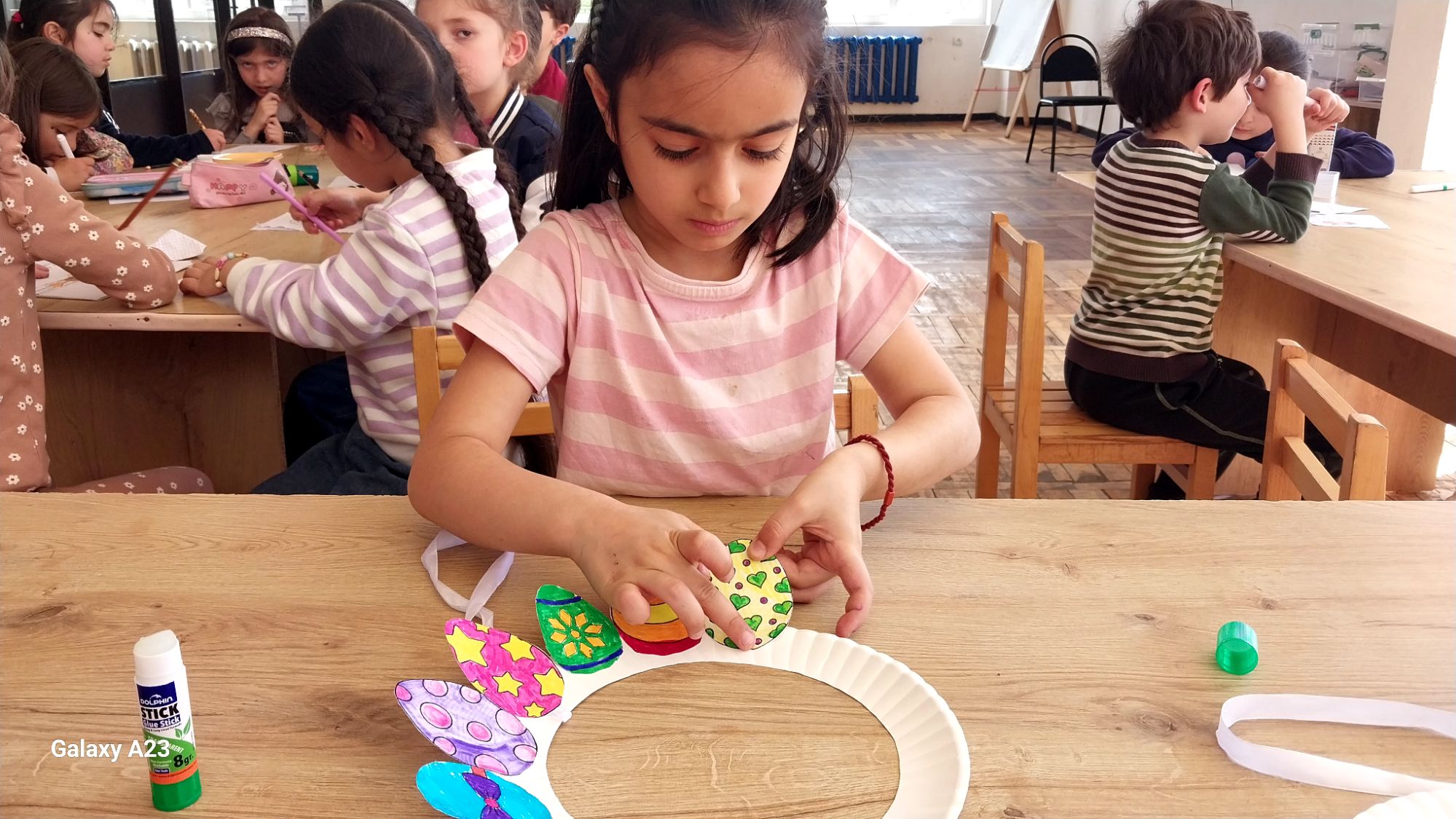 <<Զատիկ>> ուսումնական նախագծի շրջանակներում սովորողների հետ միասին պատրաստեցինք զատկական դեկոր, որը ոչ միայն զարդարեց մեր դասասենյակը, այլև ստեղծեց տոնական և ուրախ մթնոլորտ։ Նախապես տպված ձվիկները երեխաները մեծ ոգևորությամբ և երանգներով գունավորեցին՝ ցուցաբերելով իրենց ստեղծագործական մտքերը։ Այնուհետև դրանք ճշգրտորեն կտրեցինք և խնամքով փակցրեցինք թղթե ափսեների վրա։ Արդյունքում ստացան յուրօրինակ և գունեղ զարդեր, որոնք արտացոլում էին Զատկի խորհրդանշանները և երեխաների ջերմ մասնակցությունը։